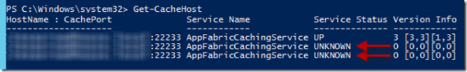 An easy way to determine this is to run “Get-CacheHost and see if any nodes’ statuses come back as “Unknown” (as seen in the below screenshot).