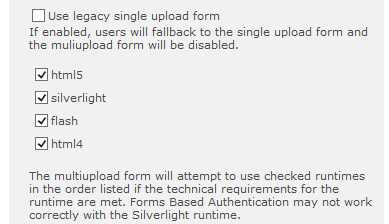 The other options allow administrators to disable specific parts of the multi-file upload control that may cause issues. The multi-file upload control attempts to use all of these technologies, but may get stuck on one that should work but fails for some reason in the environment (for example, Silverlight).