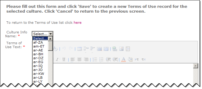 - Enter the terms of use for your chosen culture in the Terms of Use Text field.