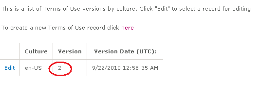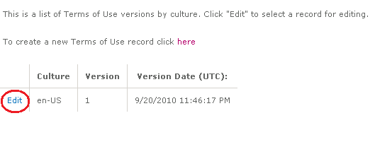 - In the Terms of Use Editor section, click on Edit Terms of Use. The Terms of Use version list appears. Out-of-the-box, this contains only the en-US (English – United States) version.