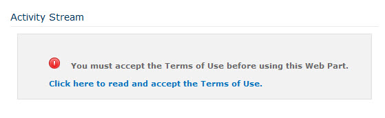 When the user clicks the link, the terms of use display in an overlay window. Accepting the terms enables Activity Stream functionality. Rejecting them keeps the message displayed.
