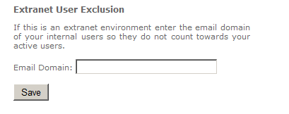 By entering the email domain of your internal users in the Extranet User Exclusion section, you can ensure the license counts shown above do not include any of your company's employees who are presumably licensed for Aurea Social already, and only count external users.