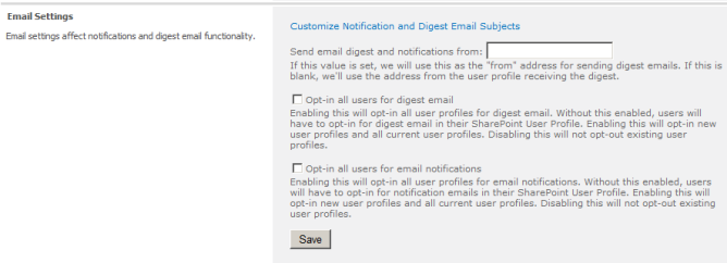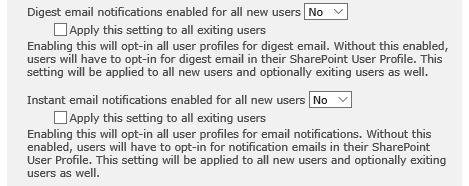 In Central Administration, two settings let administrators enable email notifications for all users if desired. Opting in sets all users who have never saved a preference in their user profile.
