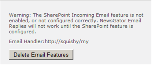 If you see this warning, you can opt to delete email features using the button. If you don't, you must enable and properly configure SharePoint’s built-in Incoming Email functionality in order for NewsGator's alert email replying feature to work, as it relies on this SharePoint feature.