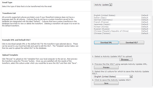 6. Using steps 3 and 4 in the Upload Template section, save the uploaded new XSLT under the appropriate language (local).