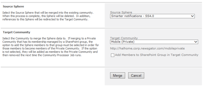 You may want to merge the conversation from a sphere into a community when that sphere has reached the end of its use (for example, a sphere used for a project).