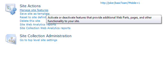 click the Manage site features