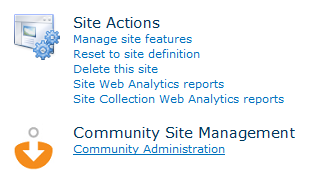 Also, a link is included in the Site Settings page to get to a community administration page that provides the same functionality as the Admin tab does in a community created through the wizard and utilizing the NewsGator Master Page.