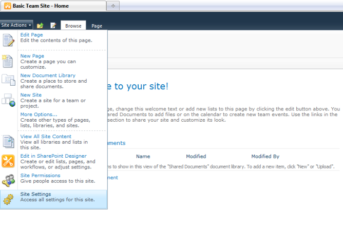 - Go to the Site Action > Site Settings for the site.