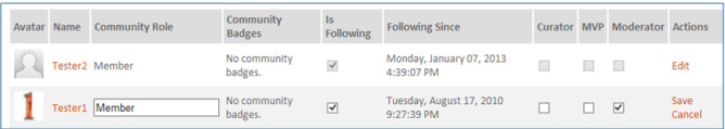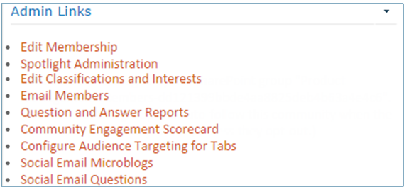 Moderators have access to the Admin tab in a community and access the following links as well as viewing the reporting web parts.