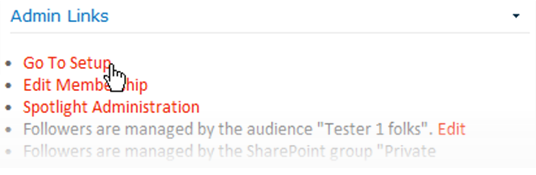 To access community setup page, go to the Admin tab of a community and click the Go To Setup link at the top of the Admin Links section: