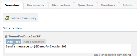 Also, users who are not administrators cannot send messages to the community by using the @ from the activity feed. If a non-admin types in “@[DemoForDocsJan29]”, that is simply treated as text, not sent to the community, and not linked in the activity stream.