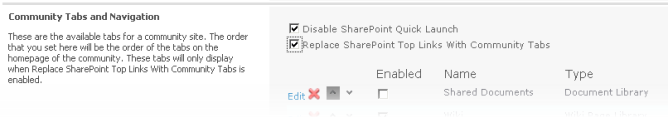 The top option in the Community Tabs and Navigation section allows you to disable the quick launch links that appear on the leftmost side of the community page.