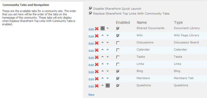 Additional tabs can be added during creation (or after the community has been established) by clicking the New link at the bottom of this section.