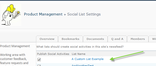 Events from custom lists and other standard list types can also be enabled. Below is an example of a custom list in the Social List Settings:
