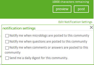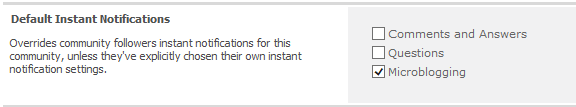 The top four checkboxes each turn on a different kind of notification email for each user who follows this community. The bottom checkbox causes the notifications options to display below the post box when a user follows the community.