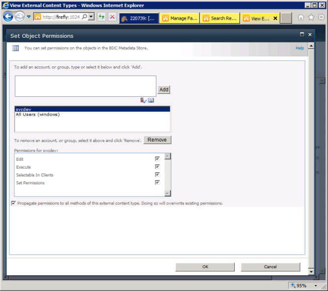 - Next, the Search indexing service needs Execute permissions on the model, in three separate places. In the following example we set specific rights for the search identity, which in the picture is "svcdev".