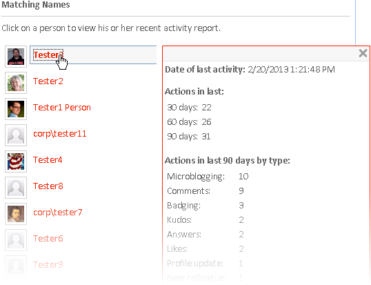 - Click on a specific user. A display panel is opened that shows the date of last activity as well as overall counts of actions in the last 30, 60 and 90 days. This can be helpful for assessing users who have greatly increased or decreased participation. It also provides a breakdown of their last 90 days of activity by type.