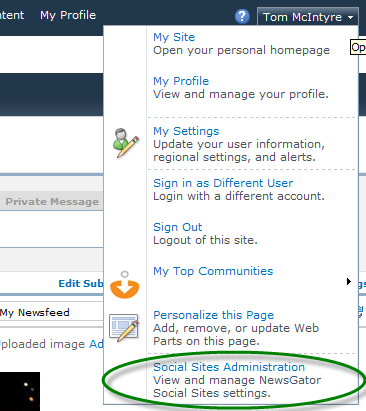 If you have the permission to see any one of these four admin pages, you can see the Social Sites Administration option in your personal menu in SharePoint.