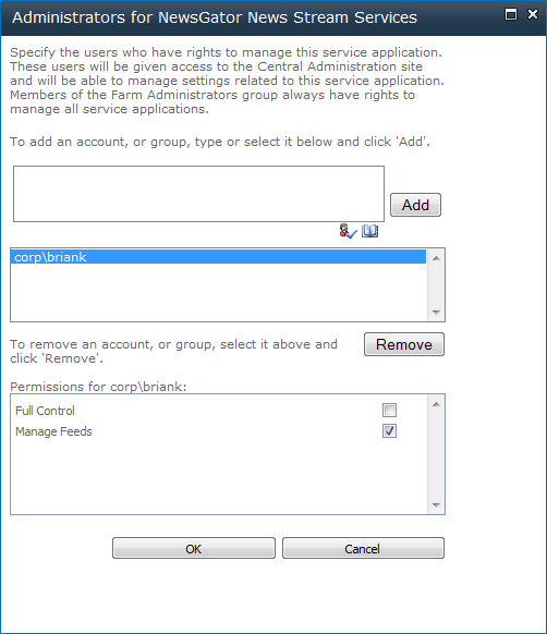 You specify which people may create and maintain this collection of feeds by granting each of them the Manage Feeds permission for the NewsGator News Stream Service Application.