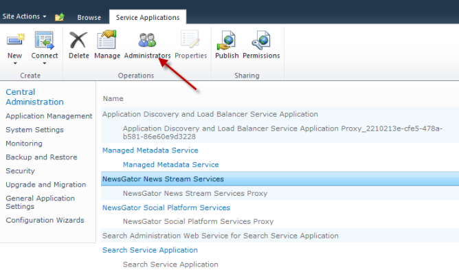 This brings up the News Stream Service application’s management page. One its sections looks like this: