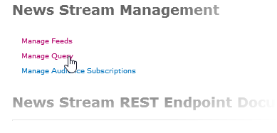To get to the Manage Query page, you must have the Manage Feeds permission. For further details, see the Specifying News Stream Administrators.