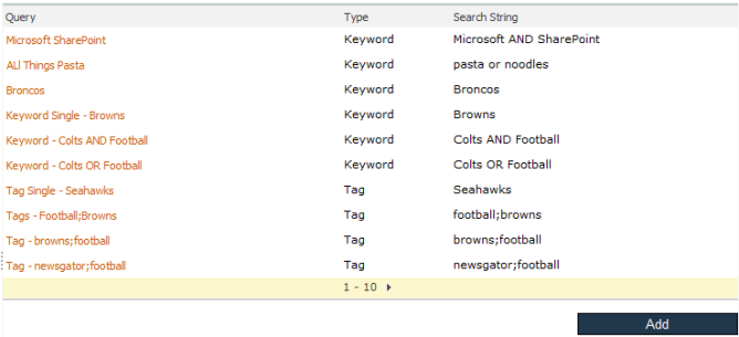 The administrator-defined system feeds can be queried in a variety of ways to display articles matching a particular theme, and/or from a particular set of system feeds. While the display of a query’s matching results is done via an instance of the News Query web part, definition of the queries available in this web part is done separately on the Manage Query page. This central UI allows the adding and editing of all queries available to the News Query web part.