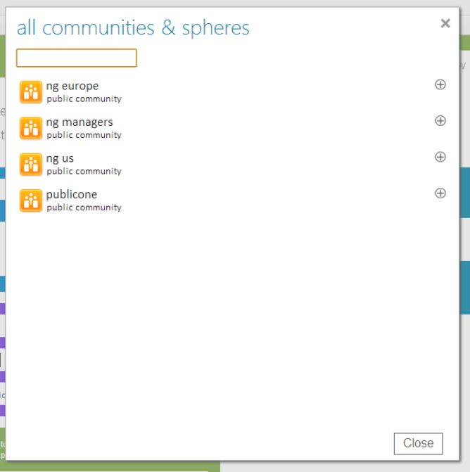 To get a list of all communities available for targeting, click the community & sphere directory link. This brings up a list of all public communities, as well as private communities the currently logged in user has access to. Communities can be added to the target list by clicking the + button, and removed by clicking the - button.