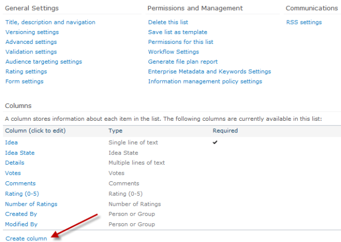 To add new fields to collect with each idea, click the Create Column link.