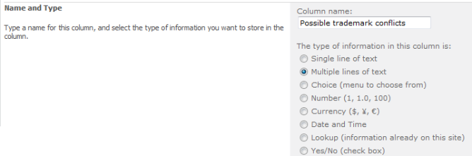 In this example, an opportunity for the person who is submitting a name idea to list potential trademark issues for that name