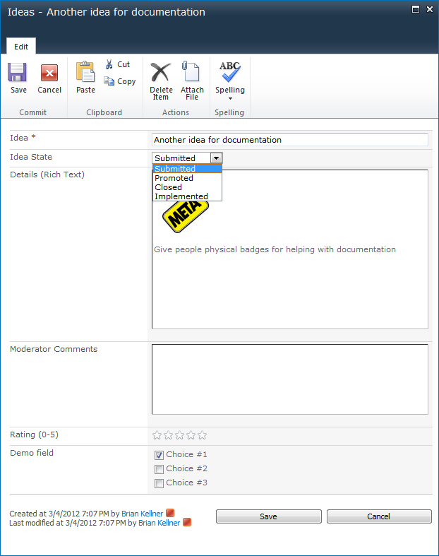 Sometimes it may be helpful to work directly in the Ideas list. End users can view this list directly and even vote from this view if they want. Admins typically accesses the list view for filtering, sorting, and editing ideas.