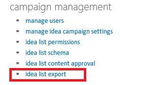 To perform the export, go to Campaign Management > Idea List Export.