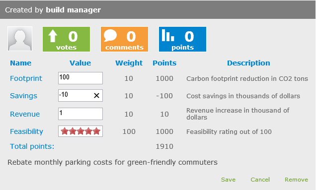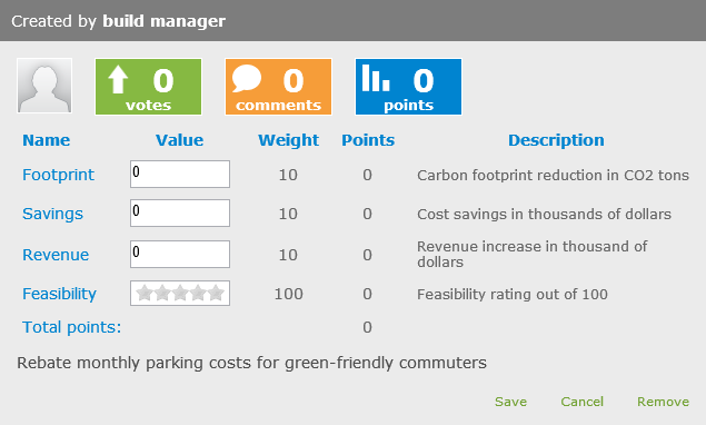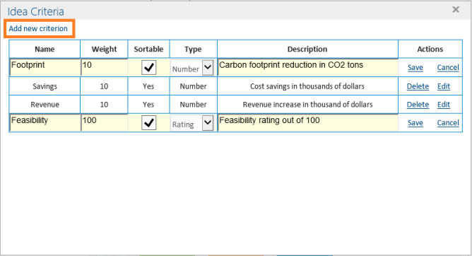 5. Enter details on the fields. Each criteria has a name, a type and a weight. Initially there are two criteria types: rating and number. The sum of the criteria (times the weight) comprises the score of the idea.
