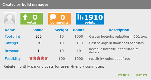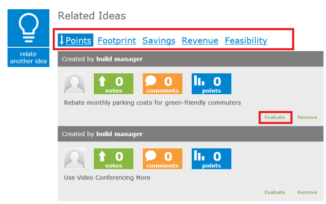 Once the criteria (at least one) are defined, sort options display in the Related Ideas area. There is one sort link for each criteria and one for overall points. A points box appears on each related idea as well as an Evaluate link.