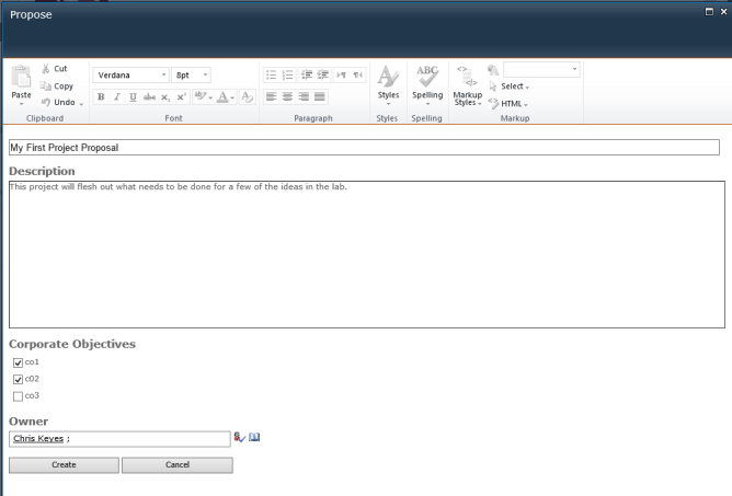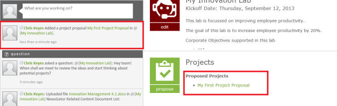 After the project proposal has been created, it is listed under Proposed Projects and there is an activity in the stream to reflect that action.