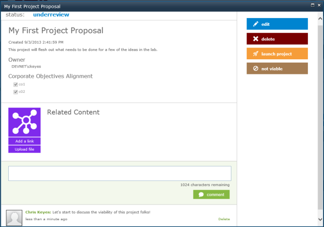 The project community is created with the key meta-data from the project proposal including the description, the corporate objectives it aligns too and the related content. There is also a link to the back to the originating lab.