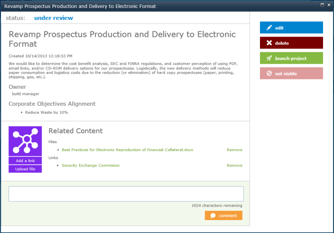 A project community also helps provide continuity with the overall innovation process as it is linked to the Labs, Project Proposals, and ideas that inspired it, as well as the Corporate Objectives it aligns with.