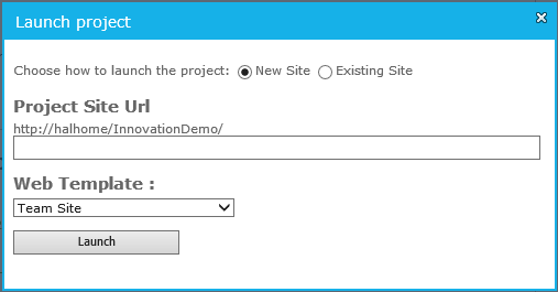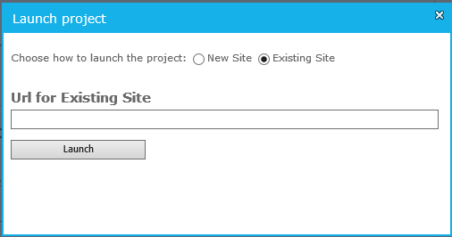 To launch the Project (as far as the application is concerned), click on Launch Project. The user has the option to create a new project or launch into an existing one. When creating a new one, the parent URL is the lab and the kind of community template must be specified.