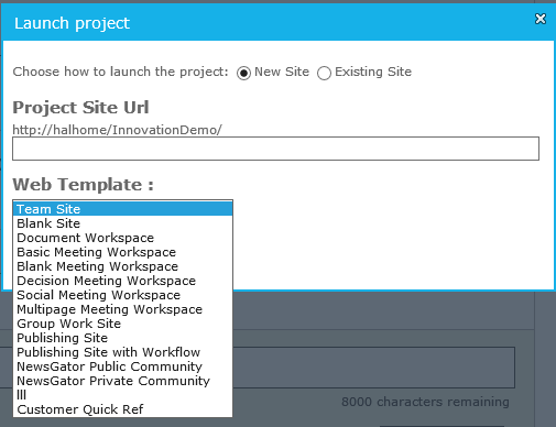 Selecting Existing Site pops up a panel prompting you for a URL. This follows a similar process when creating a project community from scratch. That is: