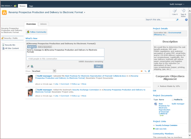 The project community is a place to support the project implementation. While the implementation of the project may use a wide variety of project management tools to manage the appropriate resources and deliverables, the community can support the conversations and collaboration among project team members as well as some of the project management artifacts (for example, documents, links etc.).