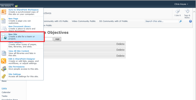 - Go to the Site Actions menu and click on New Site.