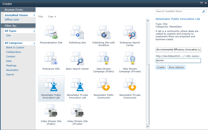 - Select the Innovation Lab template, specify a name for the lab and a relative URL as seen below: