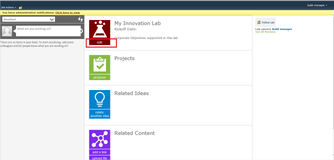To create a lab in SharePoint 2013, create a regular Social Sites community and then activate the lab feature “NewsGator Innovation Lab” for that community (Site Settings > Site Actions > Manage Site Features):