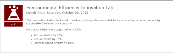 - Click on Edit in the top middle box to do so. Here you can enter the Lab description, goals, and corporate objectives. These details inform Lab visitors about the purpose of this Lab and the corporate objectives it is supporting.