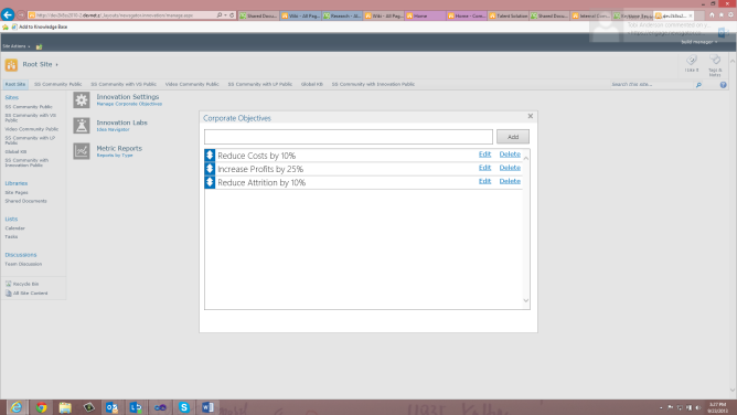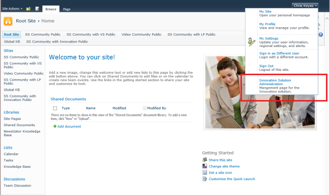 To setup a corporate objective, click on Innovation Solution Administration in the personal pull-down menu in the top tight corner in SharePoint.
