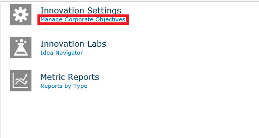 Click on the Manage Corporate Objectives link under Innovation Settings.