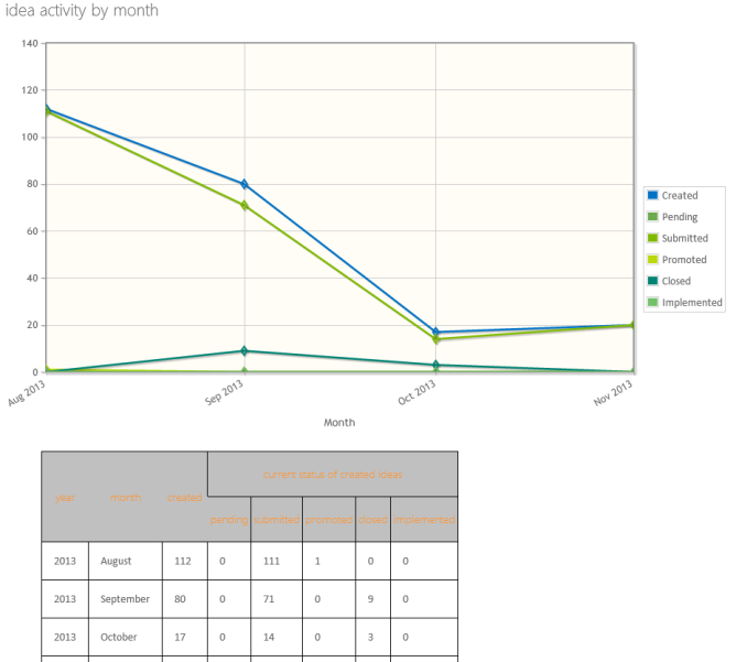 - Idea activity by Month: Ideas created by month, ideas by status by month