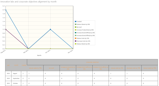 - Innovation Labs and Corporate Objectives Alignment by Month : New labs per month, total corporate objective alignment per month