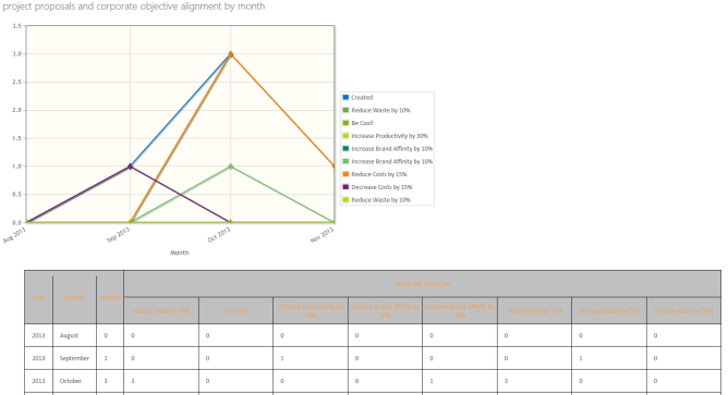 - Project Proposals and Corporate Objective Alignment by Month: New project proposals per month, total corporate objective alignment per month
