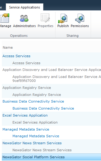 Access to systemwide Spotlight administration is granted in SharePoint Central Administration. Highlight NewsGator Social Platform Services and click Administrators in the ribbon.